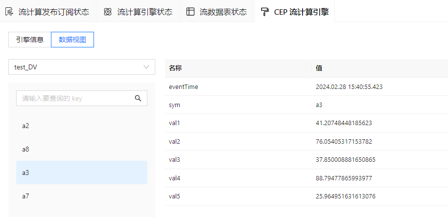 通过本页,用户可以实时监控 CEP 内部数据状态(例如监控值变化),同时提供便捷交互操作进行测试。该页面仅支持 3.00 版本 server。