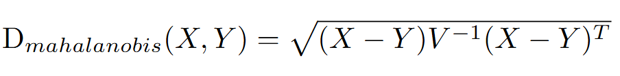 计算两个一维数值向量(X 和 Y)之间的马氏距离,公式定义如下: