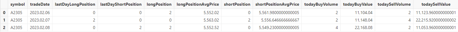 回测运行结束之后,可以通过相应的接口获取每日持仓、每日权益、收益概述、成交明细和策略中用户自定义的逻辑上下文。回测插件提供的完整回测结果接口可以参阅回测插件的接口说明文档。下图为本例获得的每日持仓数据: