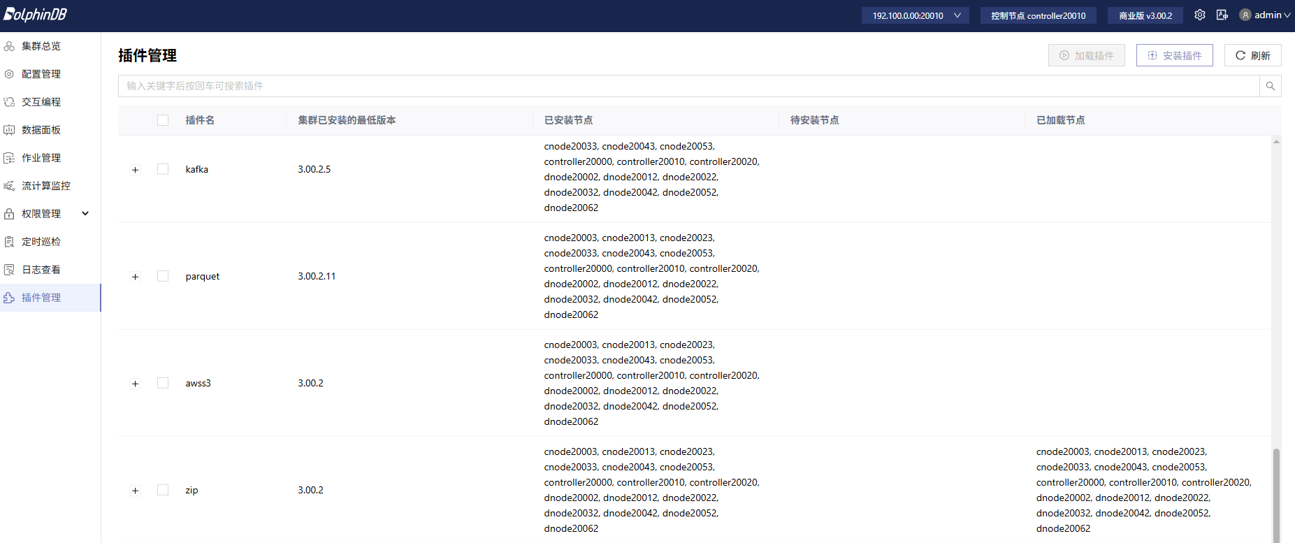 通过插件管理界面,管理员用户可以在任一节点上统一管理集群中的插件,包括查看插件版本、一键安装与加载插件,从而确保插件版本与集群中部署的 DolphinDB server 版本一致,避免节点间插件版本不一致的问题。