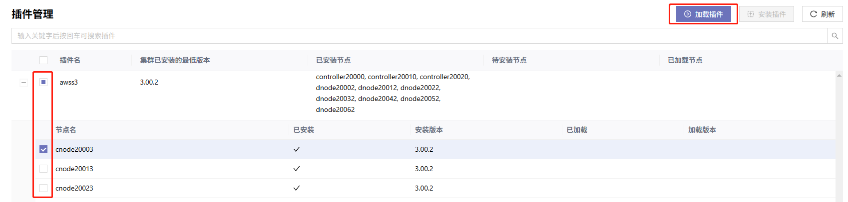 如需将插件加载到集群中特定节点,可展开目标插件下的二级菜单,选择要加载的节点,并点击右上角加载插件。