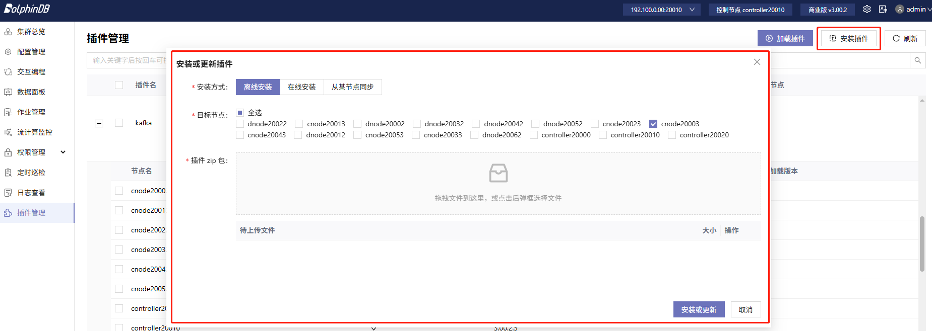 在弹窗中选择在线安装,选择要安装/更新的插件、目标节点、插件版本(默认为与当前 DolphinDB server