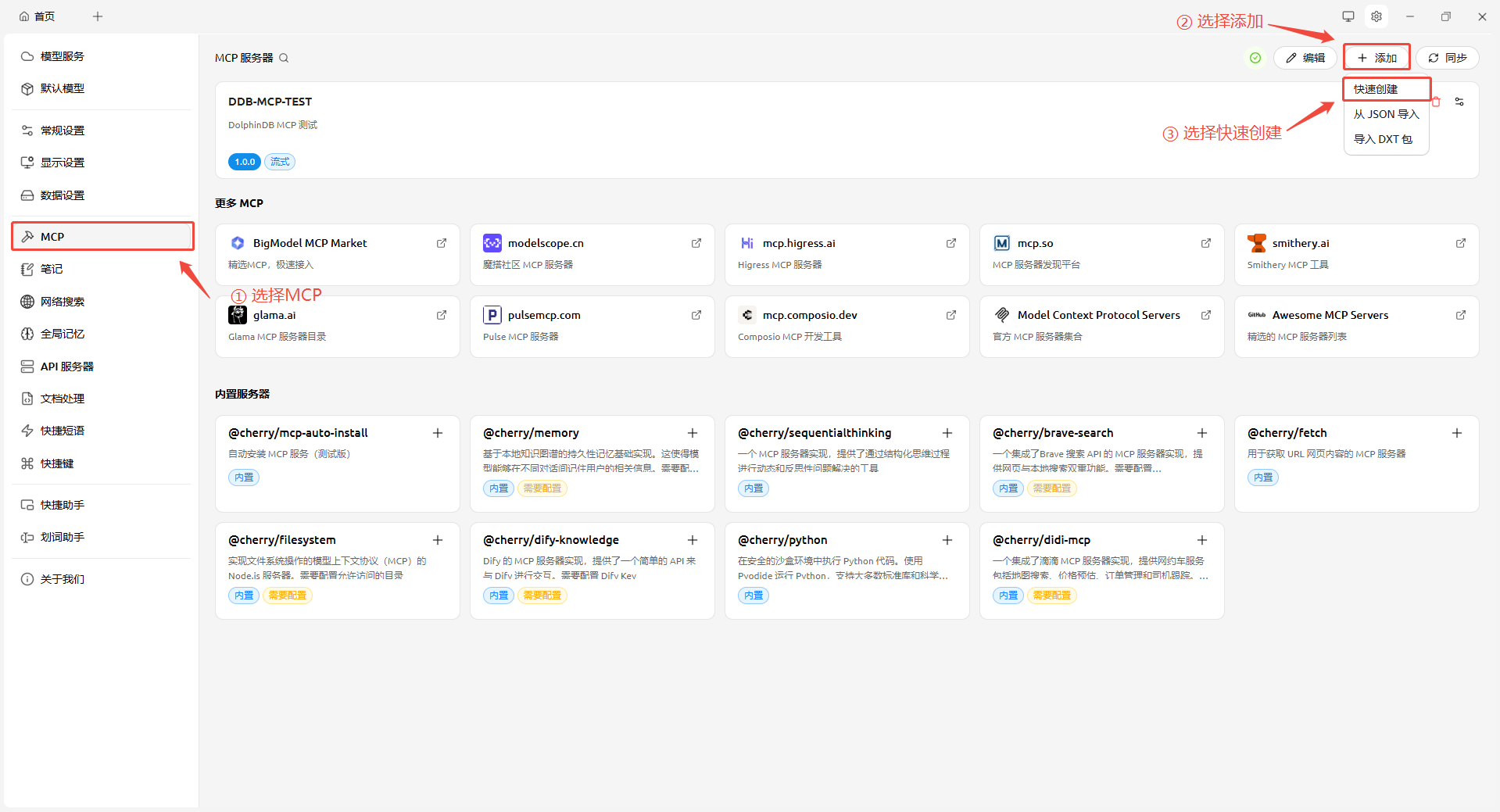 进入设置界面后在左边侧栏选择 “MCP”,点击右上角的 “添加”,选择 “快速创建”,进入 MCP 添加界面。
