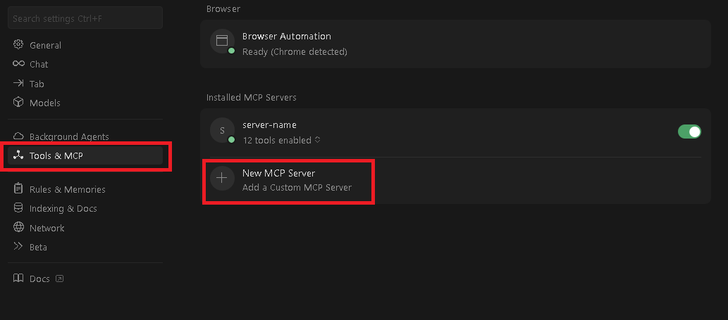 打开 Cursor 平台,点击右上角设置按键,点击左侧边栏 “Tools & MCP”,点击 “New MCP Server”,添加新的 MCP Server。