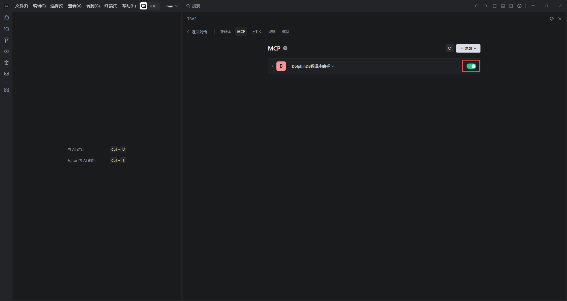 配置服务器完成后,在 “话题” 界面下新建话题,在上方选择模型,在下方侧栏中选择 DolphinDB 的 MCP 服务,即可开始使用 MCP 功能。