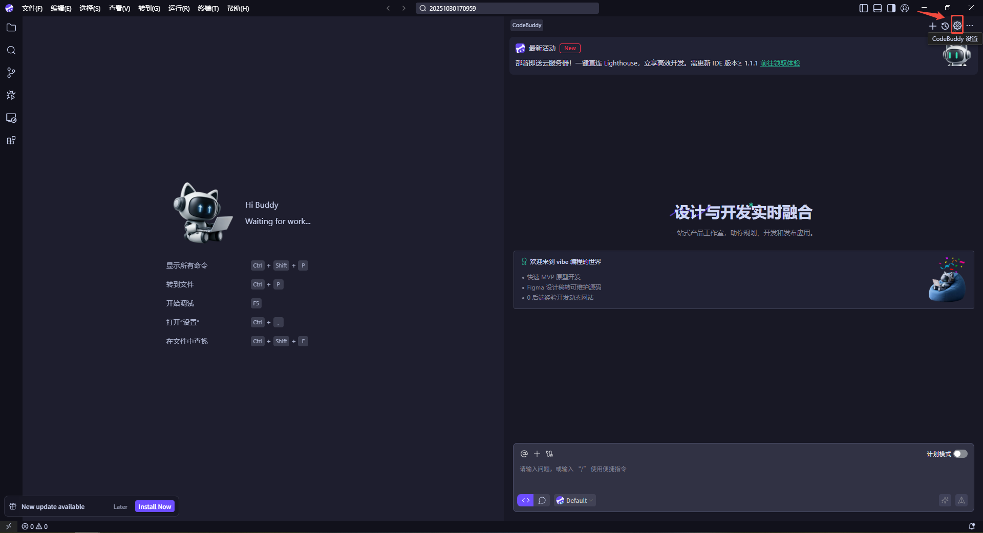 登录 CodeBuddy 后,打开 AI 侧栏,点击右上角的“CodeBuddy 设置”。