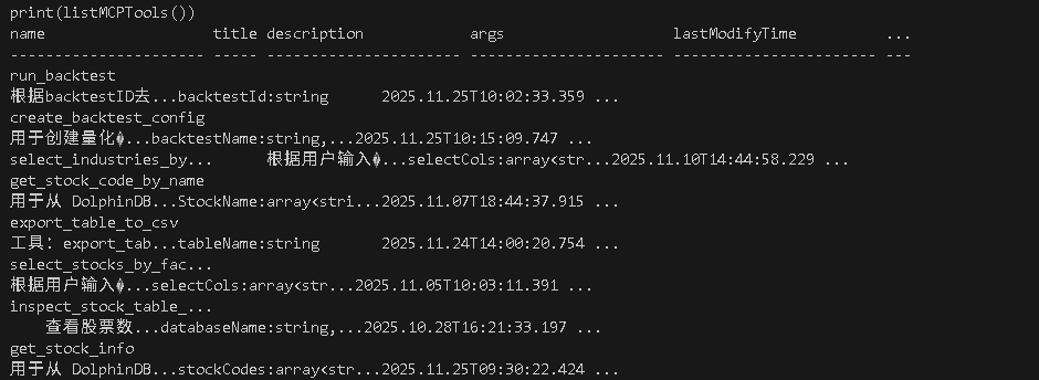 DolphinDB MCP Server 支持集群部署。工具在调用时,会在对应的数据节点和计算节点执行,返回结果给客户端。假如集群包含 ip:port1 控制节点, ip:port2 计算节点 和 ip:port3 数据节点,用户可以在任意节点定义工具,调用时,工具会在调用的节点执行。例如:调用 ip:port2/mcp,工具将在 ip:port2 执行。