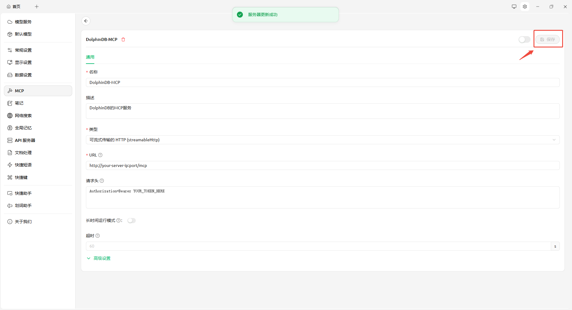 填写完成后,点击右上角的 “保存”,弹出 “服务器更新成功!” 提示即表示配置完成。