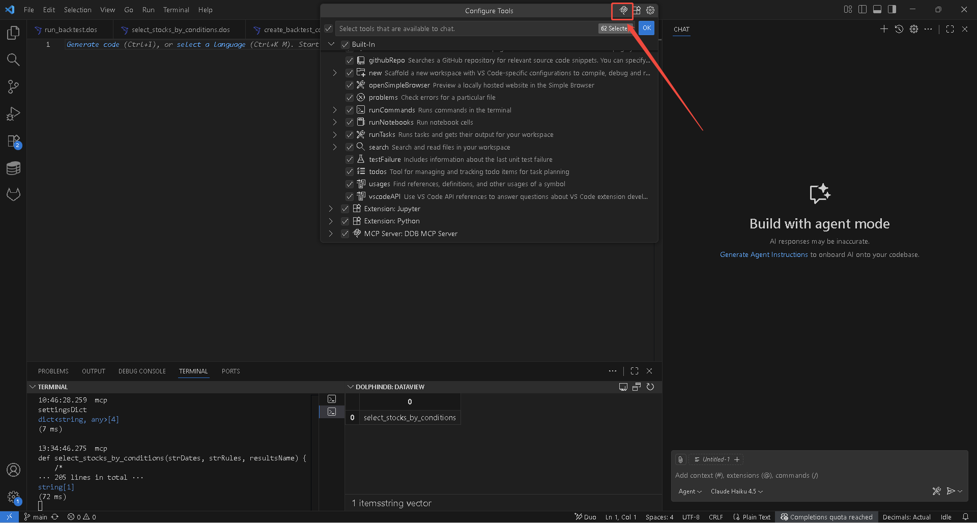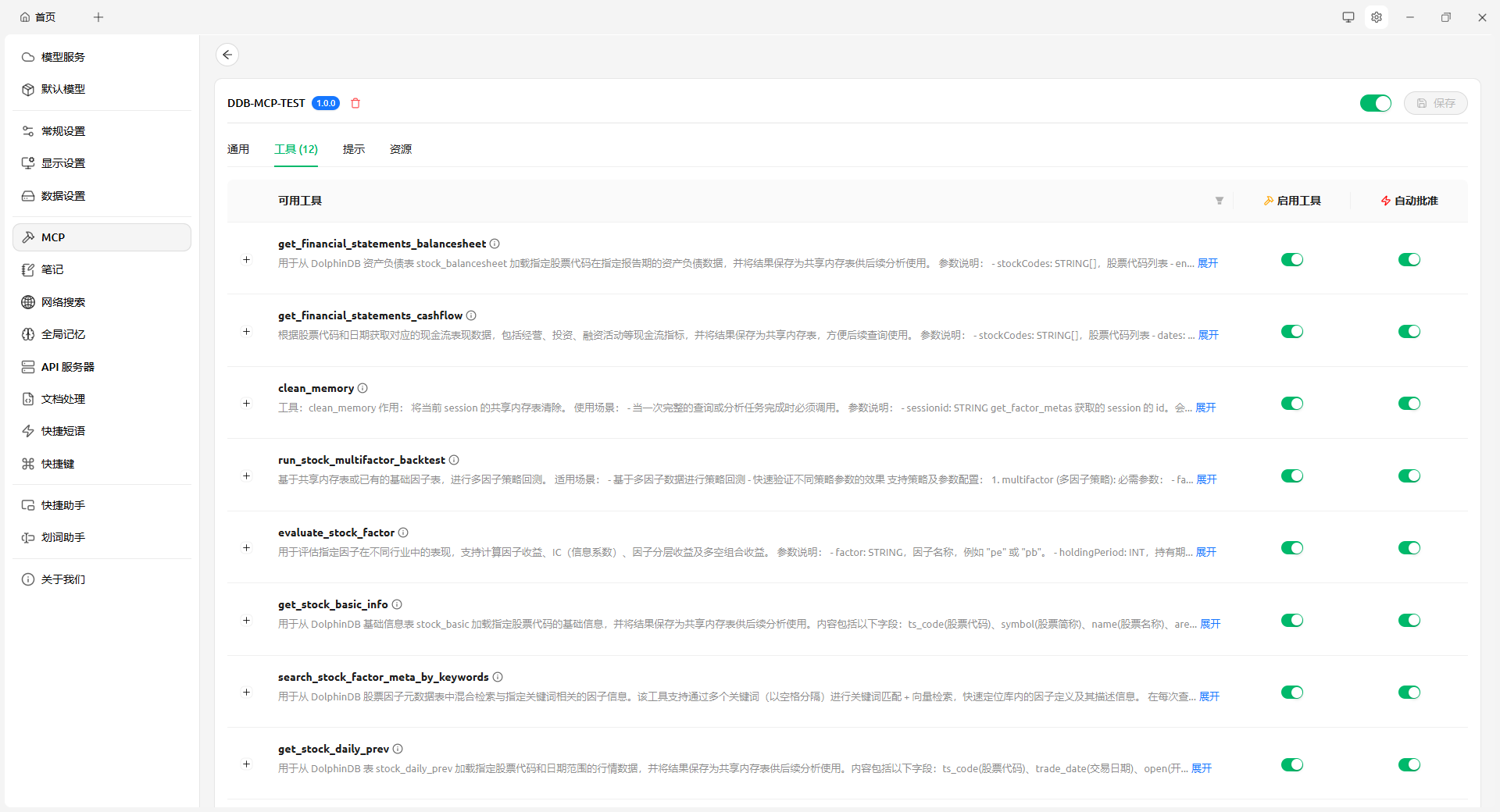 配置服务器完成后,在 “话题” 界面下新建话题,在上方选择模型,在下方侧栏中选择 DolphinDB 的 MCP 服务,即可开始使用 MCP 功能。
