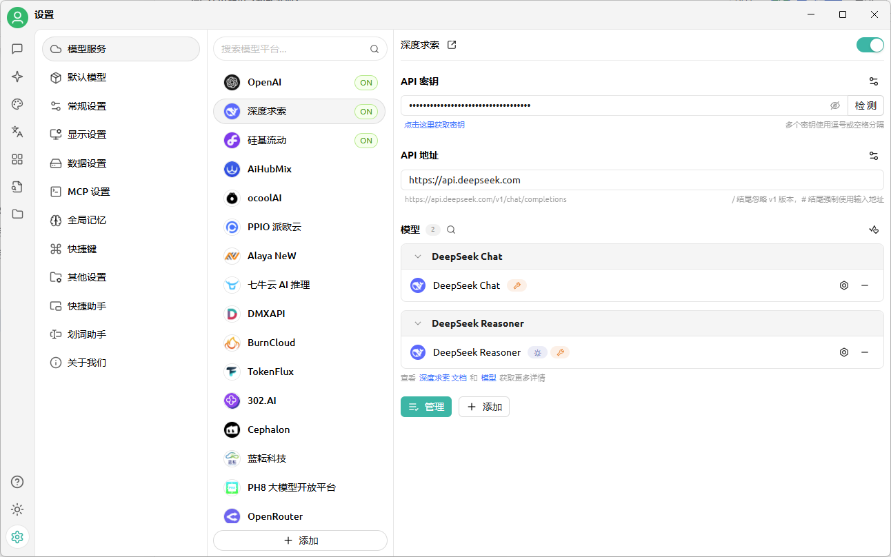 在所使用的模型服务中,填写对应模型的 API Key,以确保客户端能够正常访问模型。