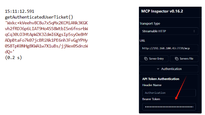 getAuthenticatedUserTicket(),将返回的 Ticket 填入Bearer Token。注意:MCP 工具权限是基于用户的 Ticket 进行检查的。建议使用 admin 用户获取 Ticket。 -