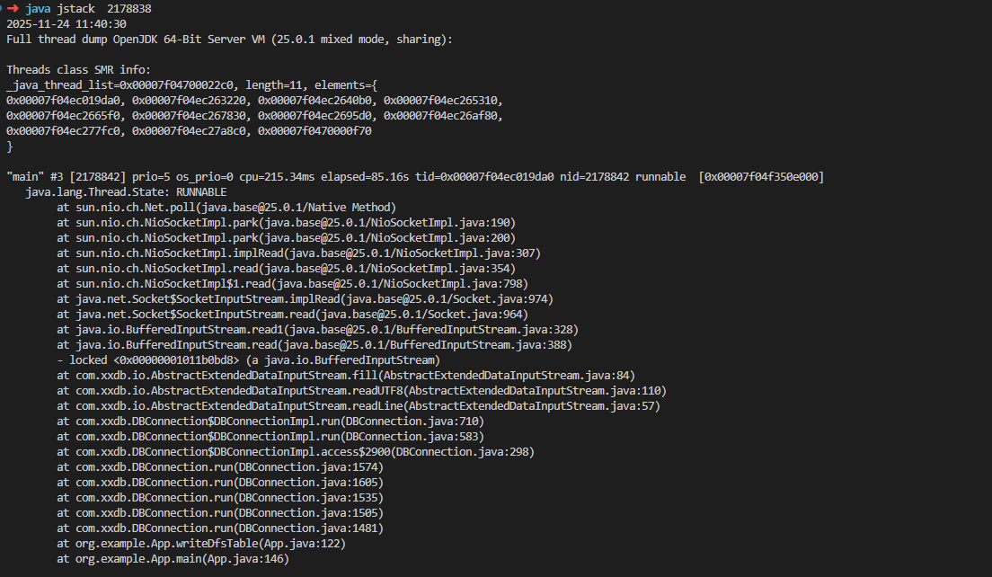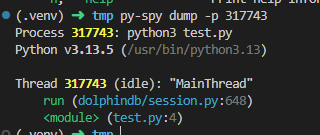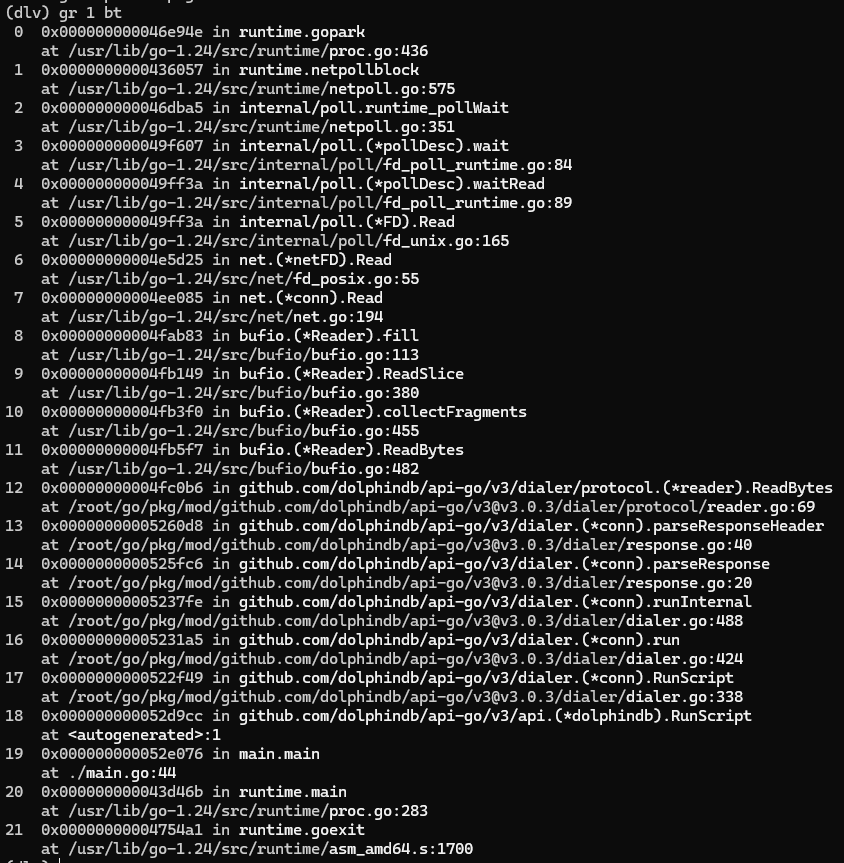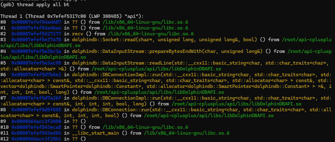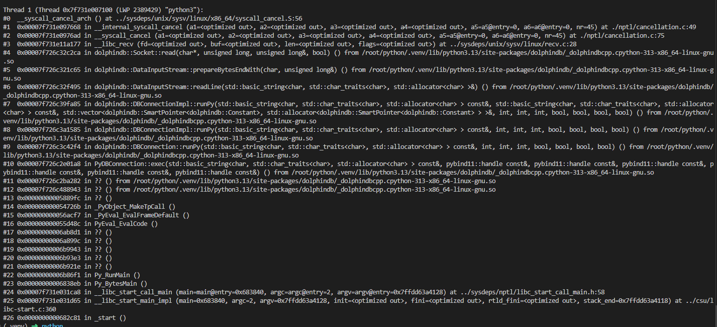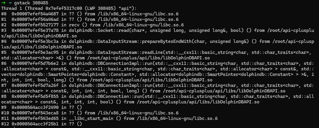 打栈价值:获取所有线程的栈信息至关重要。通过分析栈,可以识别出是哪个线程(DolphinDB API 的工作线程还是应用程序的其他线程)出了问题,以及问题的性质(如等待锁、执行耗时计算等)。这有助于将问题范围从 DolphinDB API 隔离出来,或确认其牵连性。