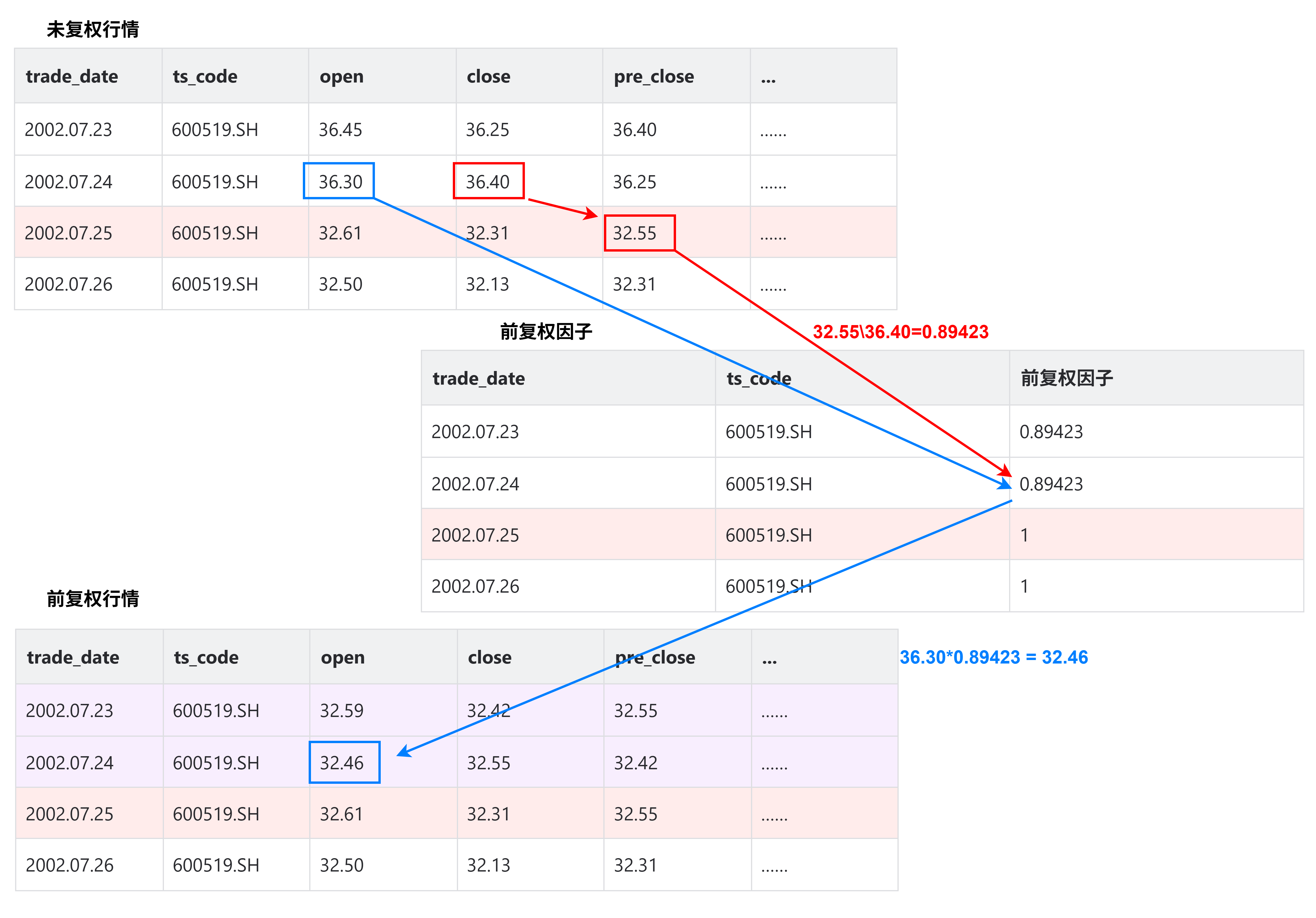 - 前复权行情等于未复权行情中的所有与价格相关的字段乘以前复权因子,图中以开盘价 open 为例展示了计算逻辑
