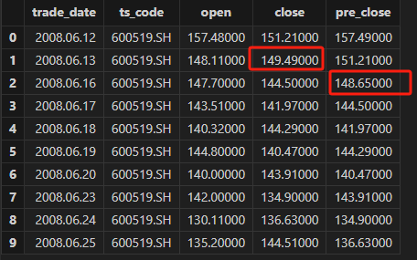 pre_close(昨日收盘价)在除权日发生了跳变:2008.06.16的 pre_close 为148.65,而上一个交易日2008.06.13的