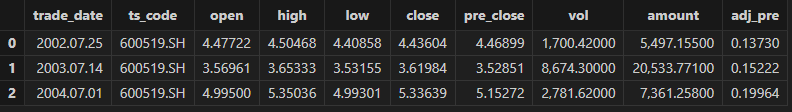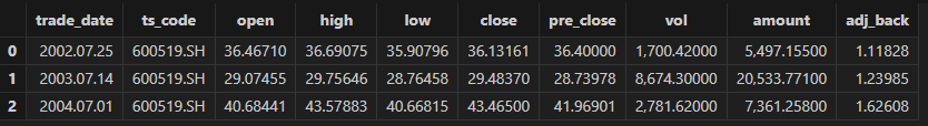 上表展示了贵州茅台(600519.SH)在2008年6月12日至17日的未复权行情片段。其中2008.06.16为除权除息日,可见未复权数据的