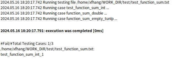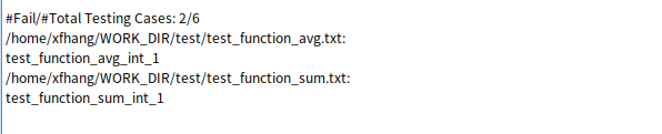 测试用例结束完成后,测试结果部分将会输出到 /home/xfhang/output/ 目录下的test_function_sum_output.txt 文件中,而正在执行的测试用例仍会打印到控制台中。